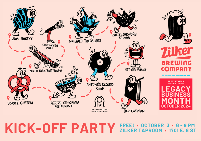 Legacy Business Month is back, y’all! October has *officially* been designated as Legacy Business Month by the City of Austin, and we couldn’t be more proud! Join us at Zilker Brewing Company for the launch of Preservation Austin’s second annual celebration of the classic businesses that have been keeping Austin cool for over 20 years.