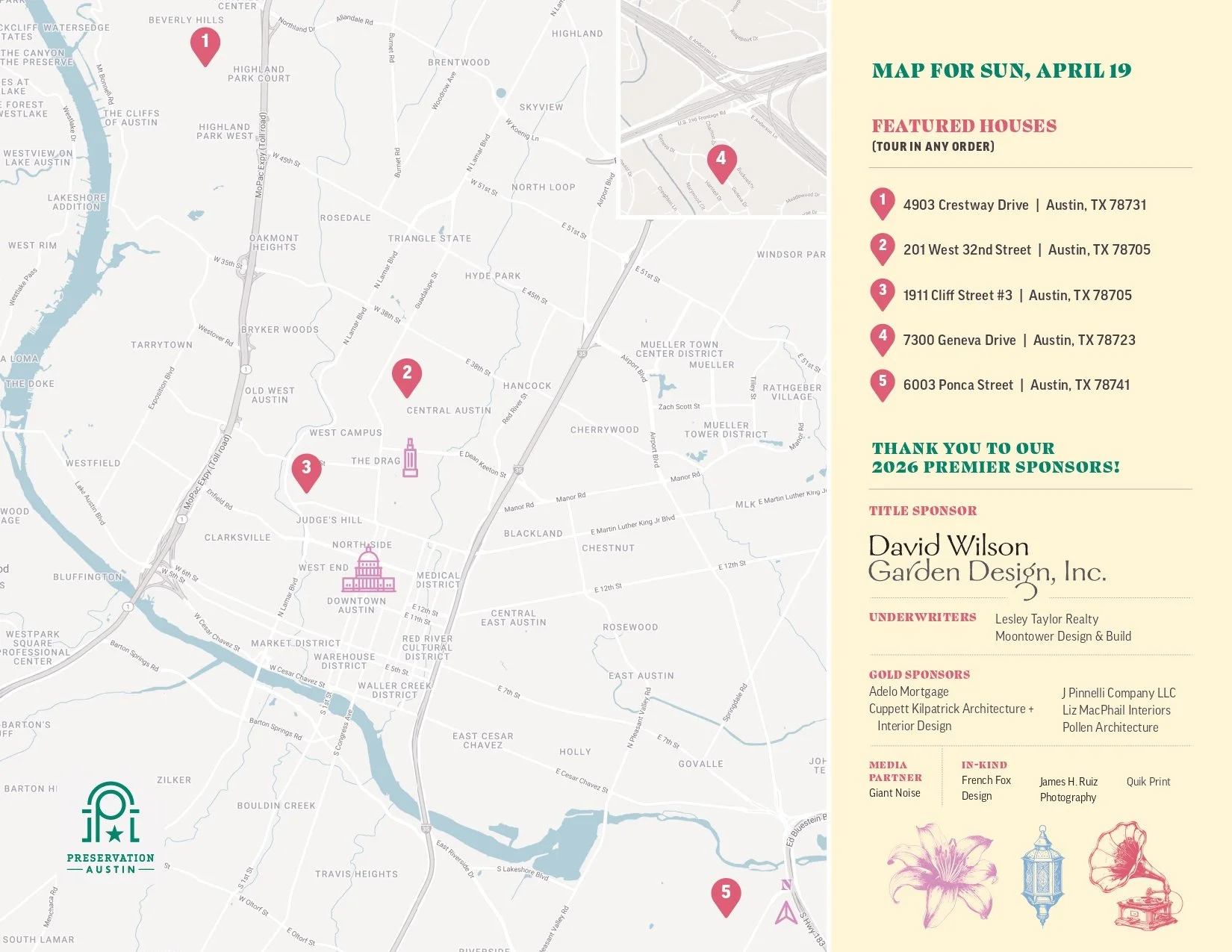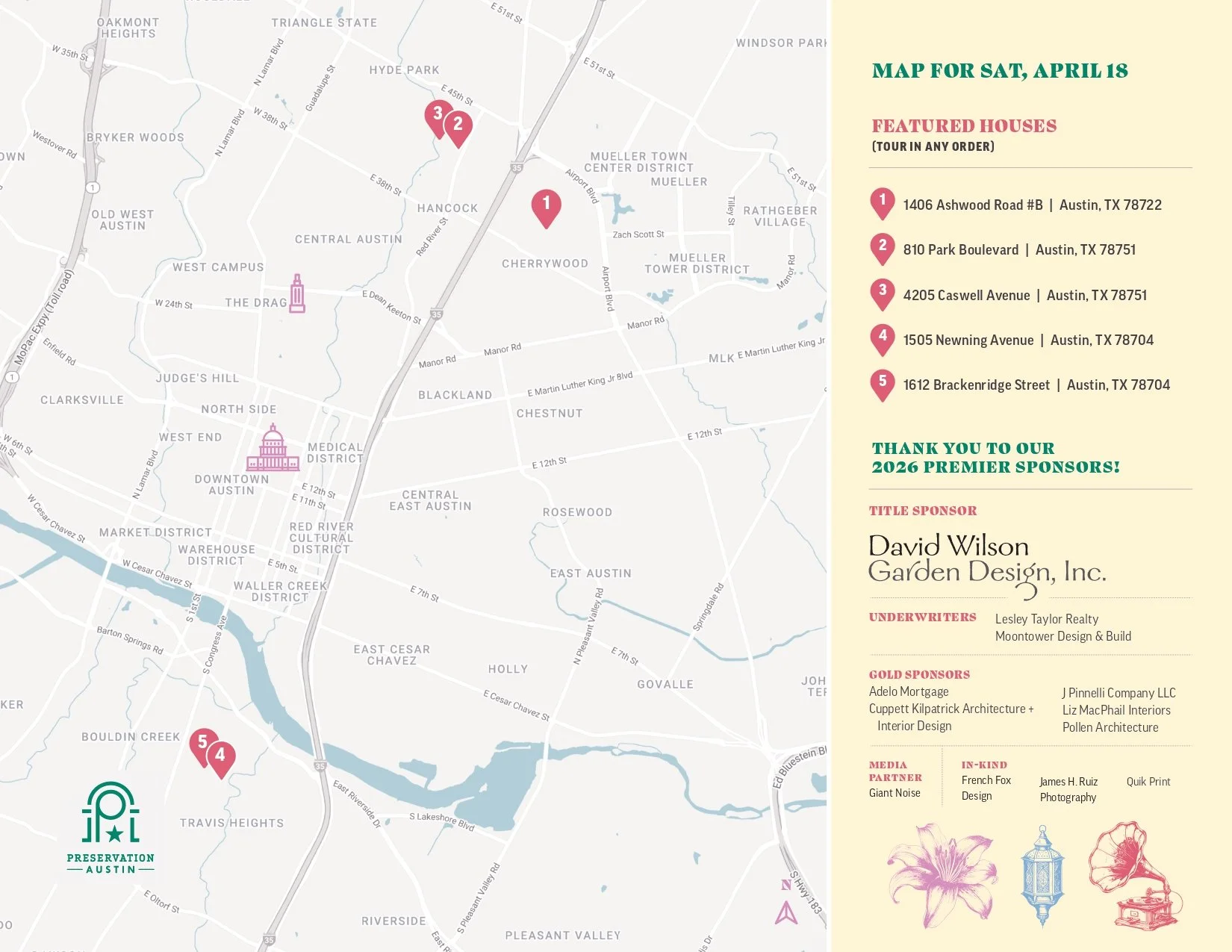 The annual Homes Tour is Preservation Austin’s marquee event and most important fundraiser. All proceeds, including ticket sales and sponsorships, support our advocacy efforts and educational programming year-round. Join us to experience this incredible showcase of community heritage, style, and architecture!