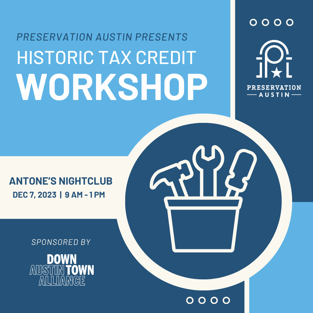 Join Preservation Austin and the Downtown Austin Alliance to learn about the opportunities and benefits of federal and state historic tax credits for transforming historic buildings here in Austin. The Historic Tax Credit (HTC) program is an incredibly valuable tool for historic property owners looking to rehabilitate older spaces and save thousands of dollars!
